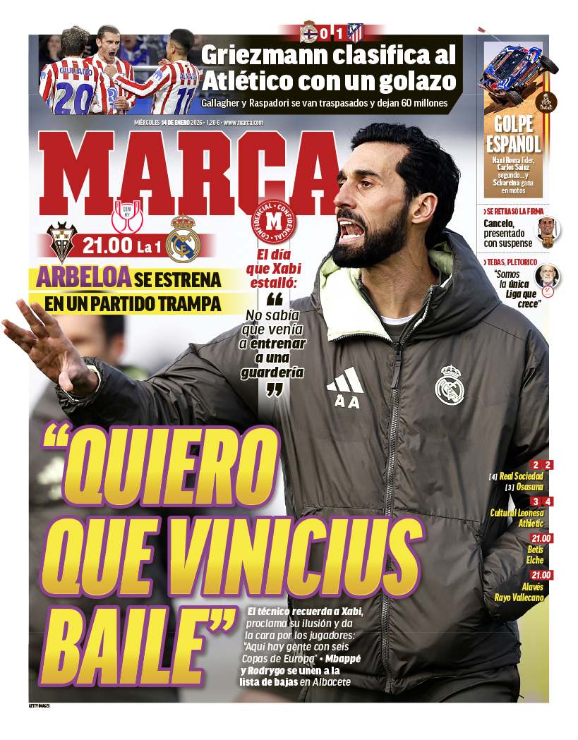 ¡Muy buenos días! El diario AS destaca a Álvaro Arbeloa en su presentación como nuevo entrenador del Real Madrid. El ya ex del Castilla ha querido recalcar que "quiere un Vinicius que sonría y baile", y que "fracasaría si quisiera ser Mourinho". Hoy, gran estreno con la disputa de los octavos de final de la Copa del Rey ante el Albacete.
