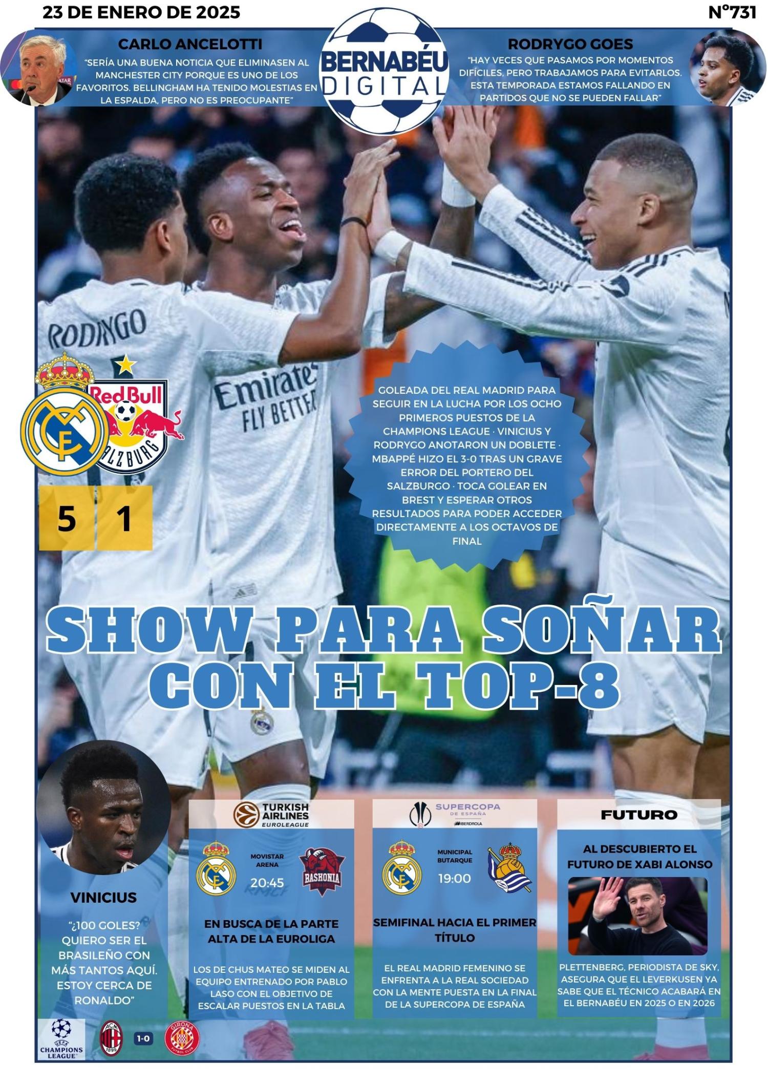 La goleada del Real Madrid por 5-1 al Salzburgo en Champions League protagoniza la Portada Bd de hoy.