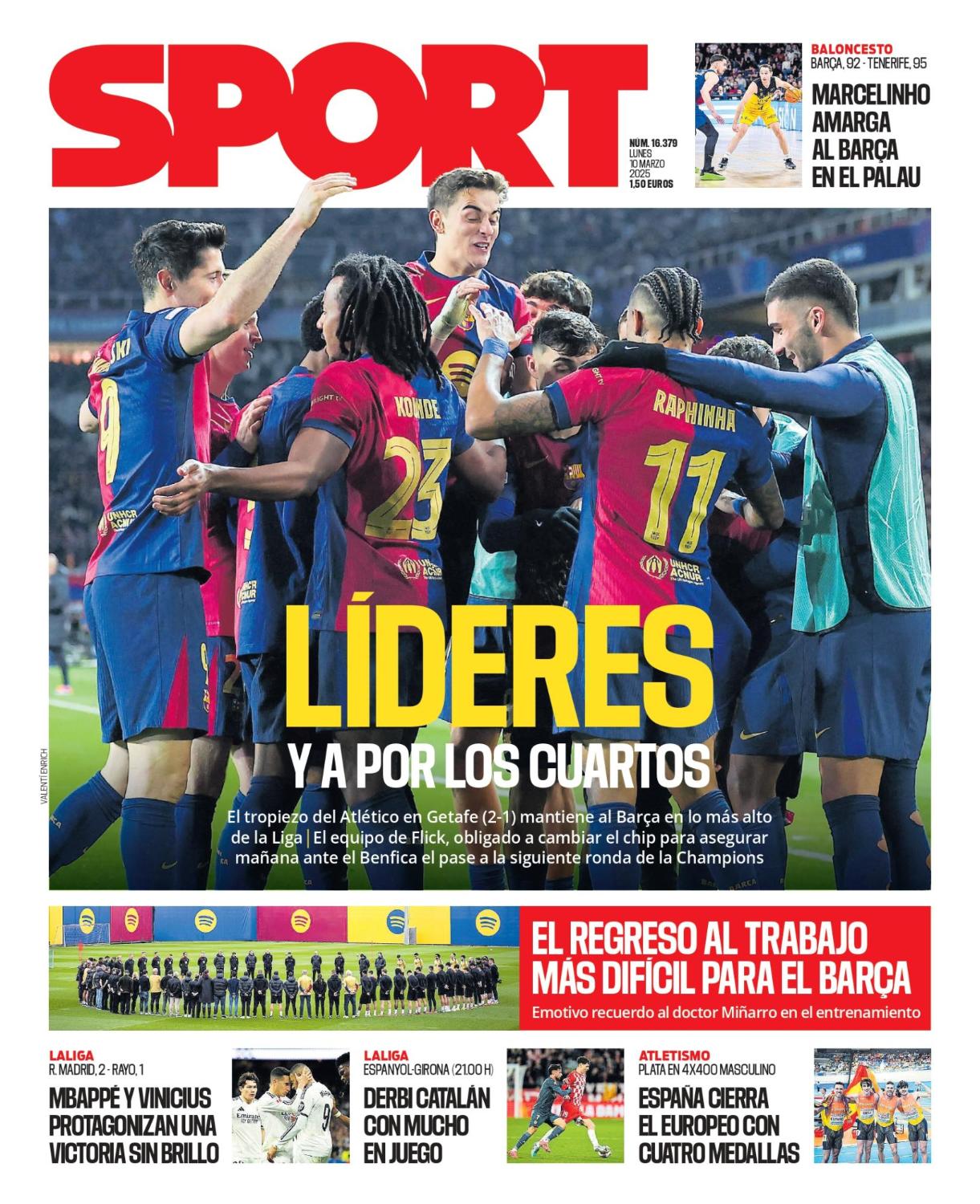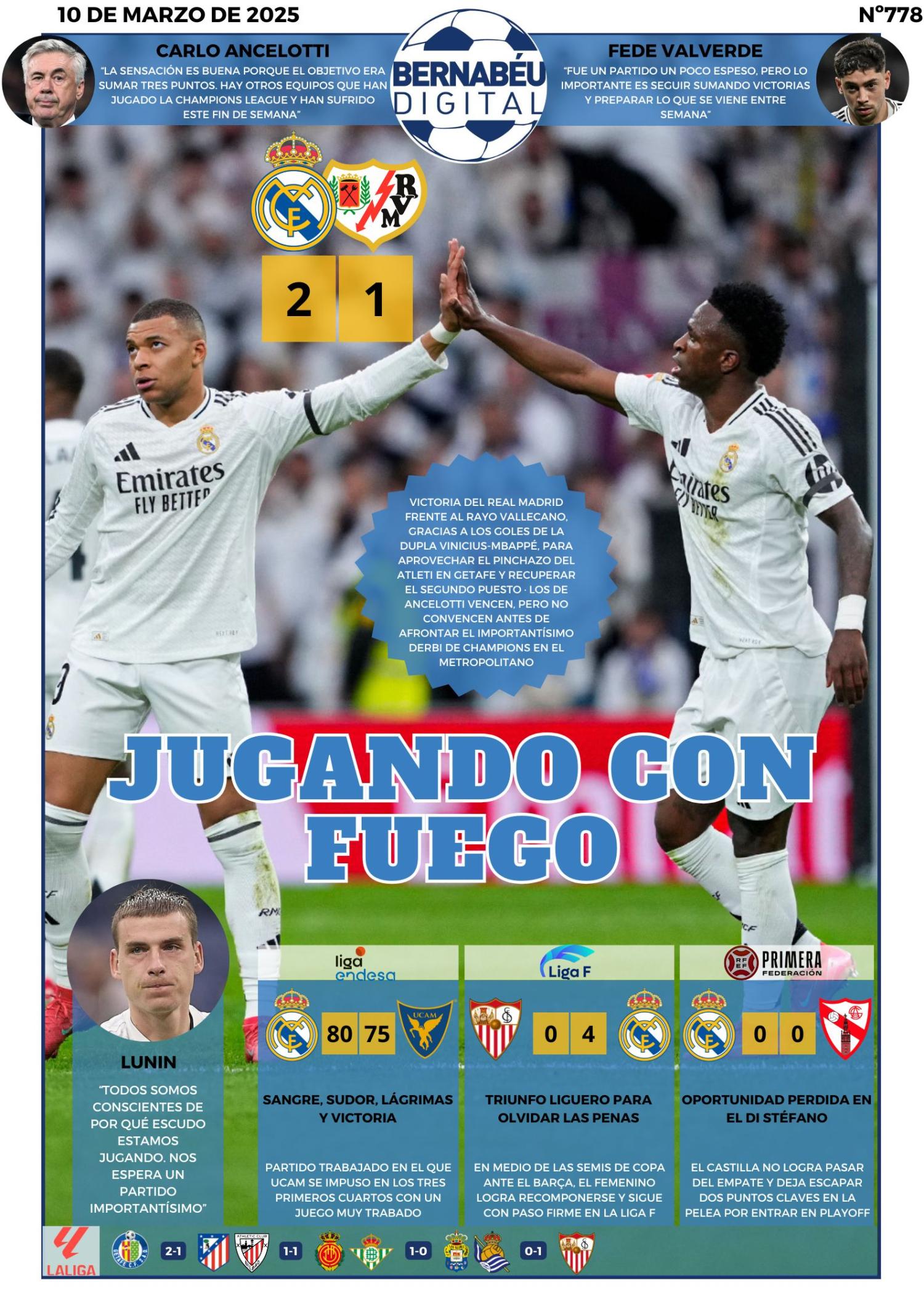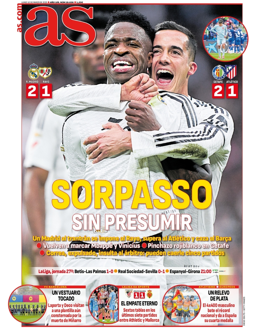 Este lunes 10 de marzo de 2025, las portadas deportivas se centran en la victoria del Real Madrid frente al Rayo Vallecano y en la derrota del Atlético ante el Getafe. Resultados que agitan aún más LaLiga.
