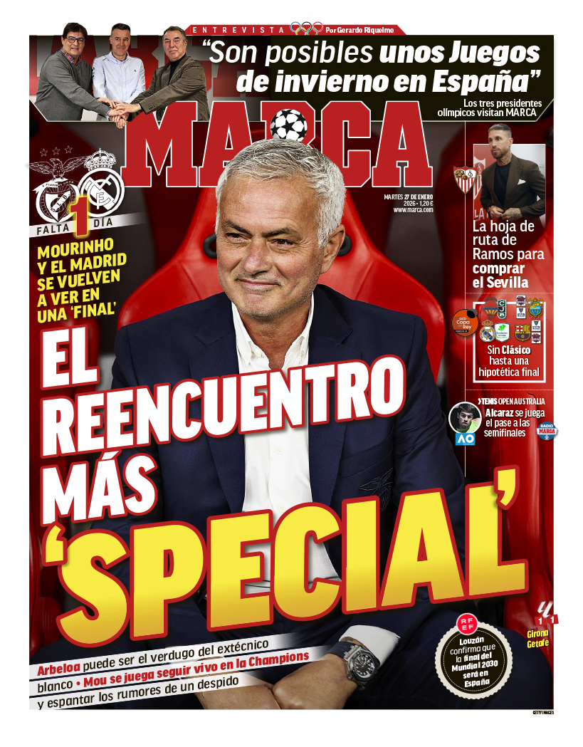 El diario Marca destaca en su portada a José Mourinho, ya que este miércoles se volverá a ver las caras con el Real Madrid a las 21:00 de la noche en un encuentro clave para Benfica y el club blanco.