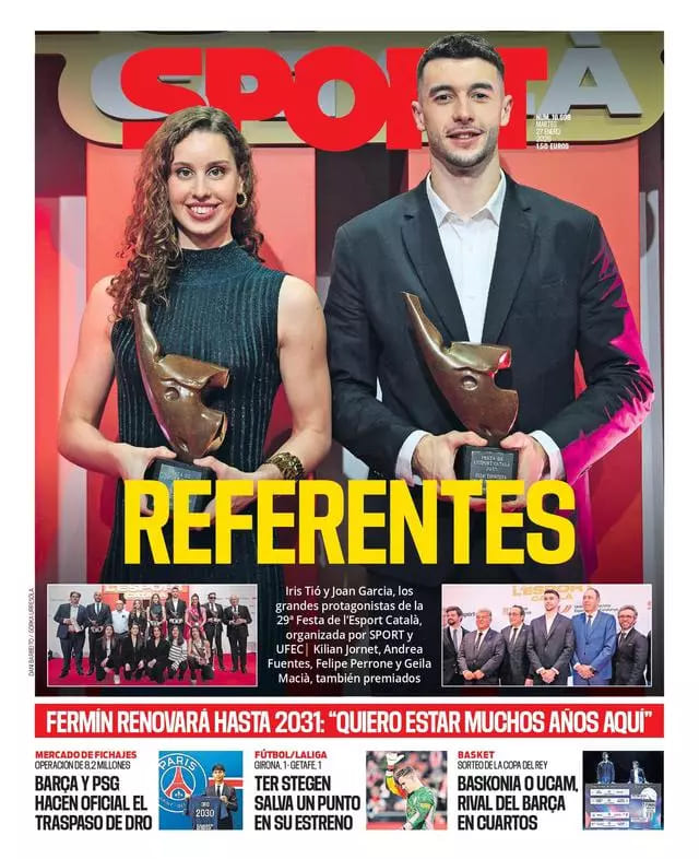 Desde Sport, Joan García e Iris Tió protagonizan su portada, ya que fueron galardonados ayer en la Festa de l'Esport Català que organizan la UFEC y el propio medio.