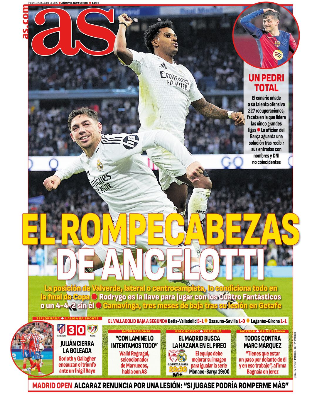 El diario As publica en su primera plana las dudas que tiene Carlo Ancelotti para la final de Copa del Rey del sábado que enfrenta a Real Madrid y FC Barcelona.