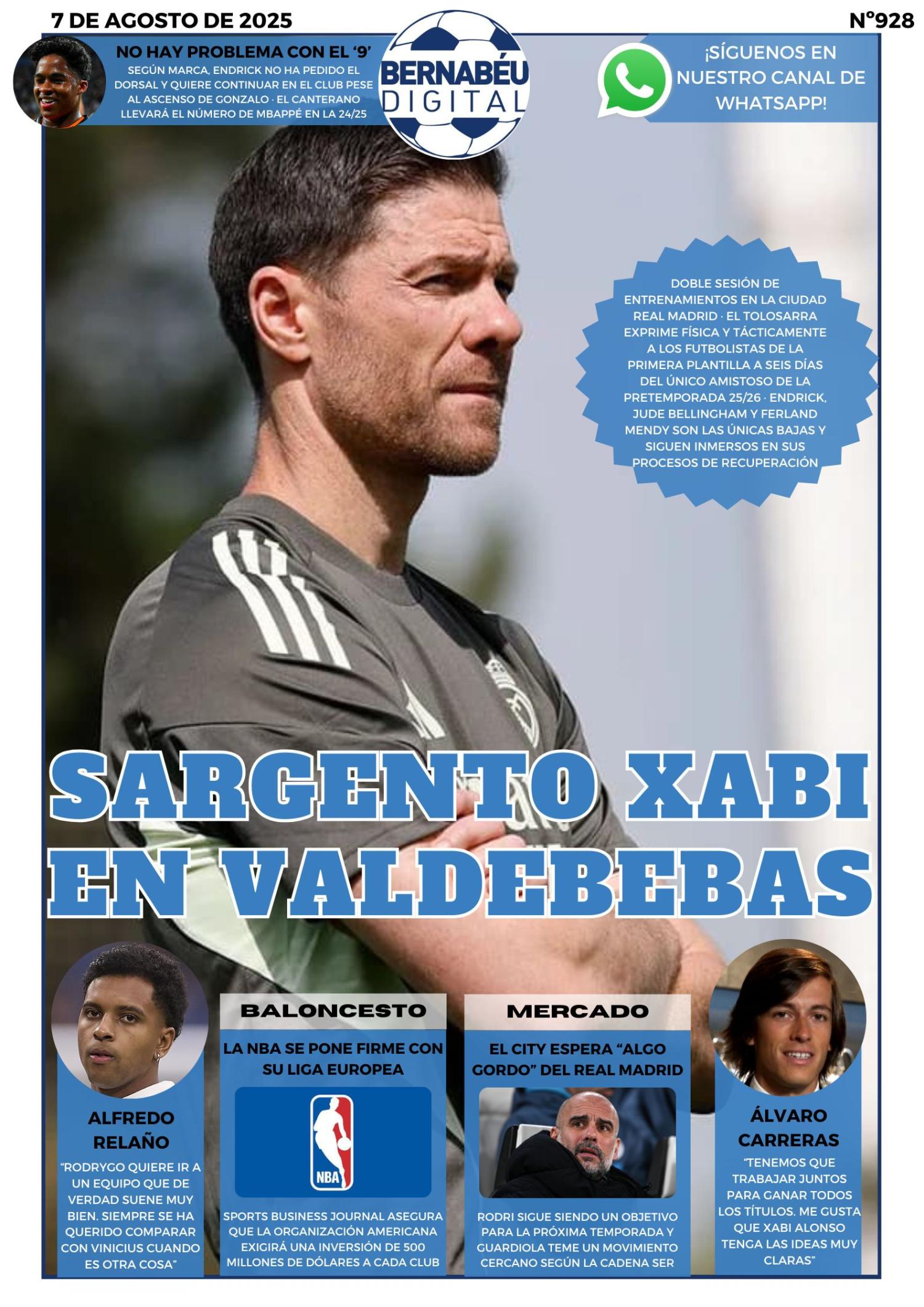 En la portada del jueves 7 de agosto, en Bernabéu Digital abrimos con la máxima exigencia de Xabi Alonso en una jornada de doble sesión en Valdebebas. No hay tiempo que perder y los futbolistas del Real Madrid ya saben cómo de las gasta el nuevo sargento de la ciudad deportiva madridista.