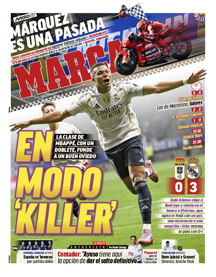 El diario Marca destaca en su portada para este lunes 25 de agosto de 2025 la victoria del Real Madrid frente al Oviedo (0-3) con un Mbappé "en modo killer" como protagonista.