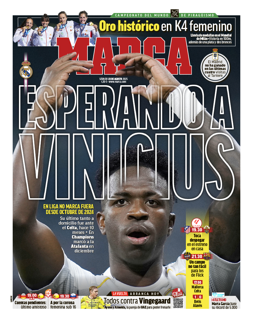 El diario Marca, en su portada para este sábado 23 de agosto de 2025, destaca la mala racha goleadora de Vinicius Junior fuera de casa.