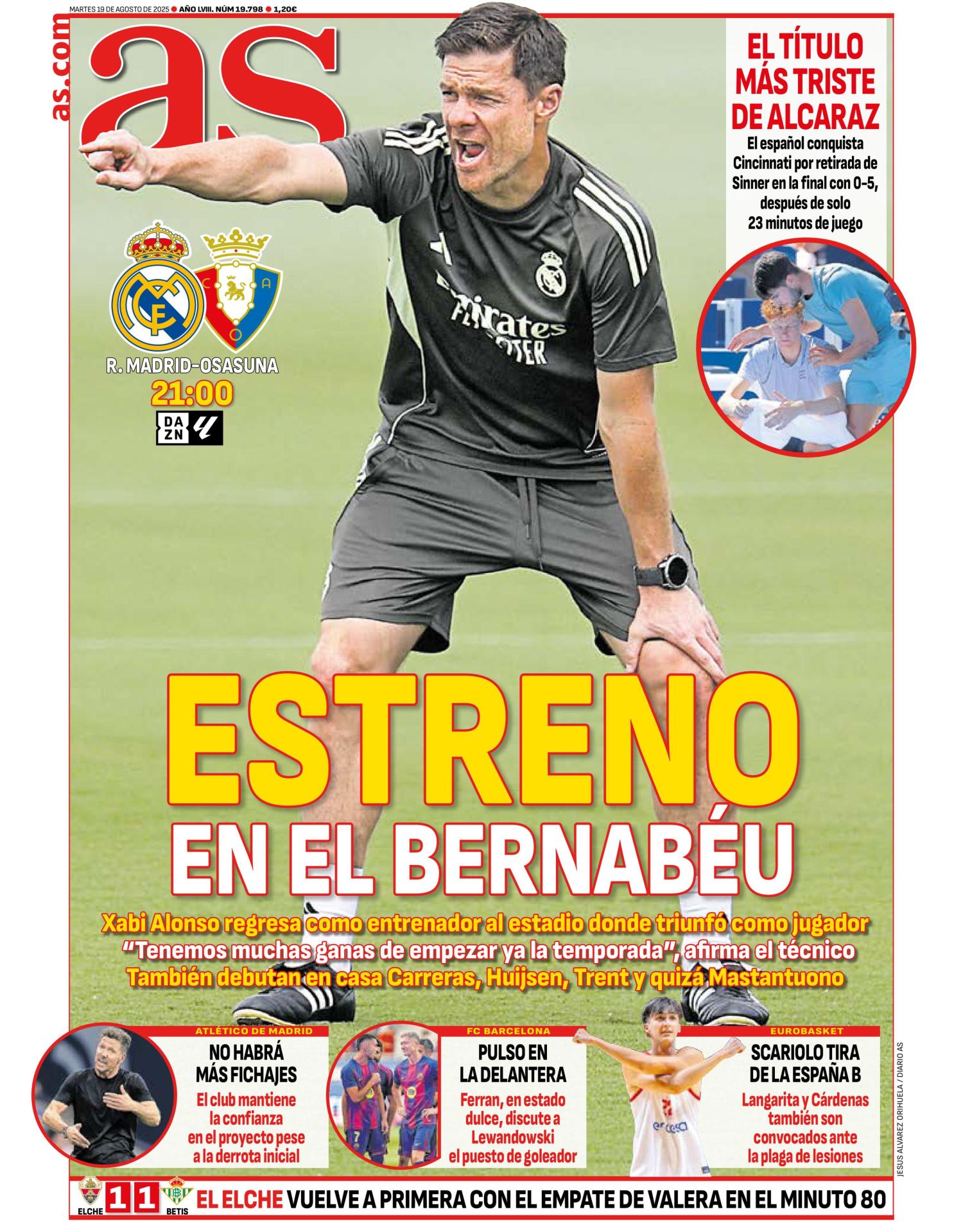 Este martes 19 de agosto de 2025, el diario as saca en portada el "estreno en el Bernabéu" de Xabi Alonso como técnico del Real Madrid.