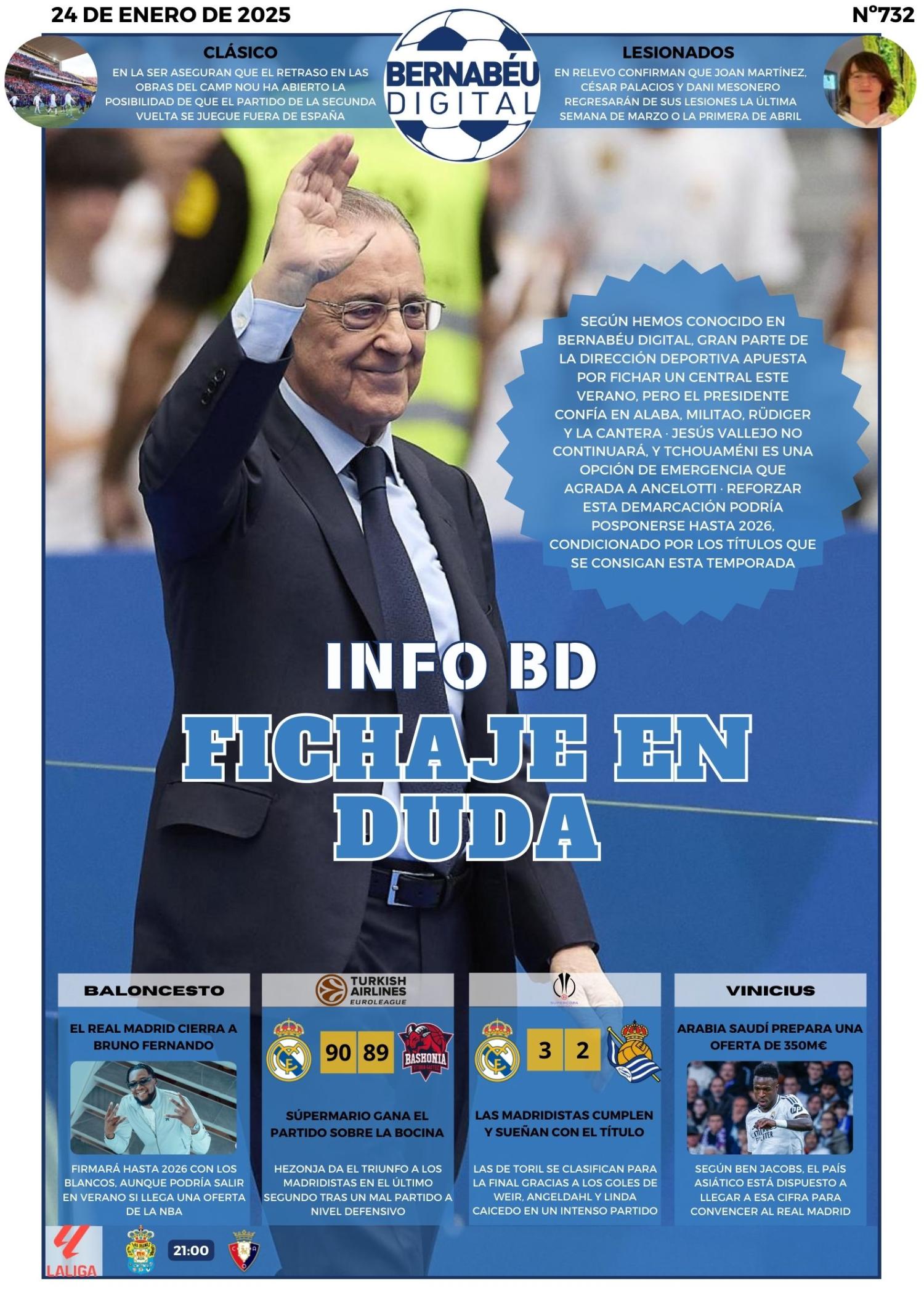 En la portada BD de este viernes destacamos la última INFO BD sobre el posible fichaje de un central. Además, hacemos referencia a los partidos del Real Madrid de baloncesto y femenino, además de la oferta por Vinicius, la llegada de Bruno Fernando, la recuperación de los canteranos lesionados y el posible clásico fuera de España.