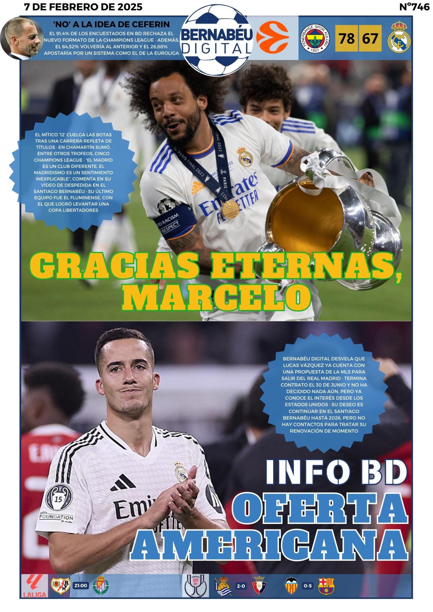 En la portada BD de este viernes destacamos la última INFO BD sobre el interés que hay en Lucas Vázquez, al igual que la retirada de Marcelo. También hacemos referencia a la derrota del Real Madrid de baloncesto en Euroliga. A ello hay que añadir lo resultados de la última Encuesta BD