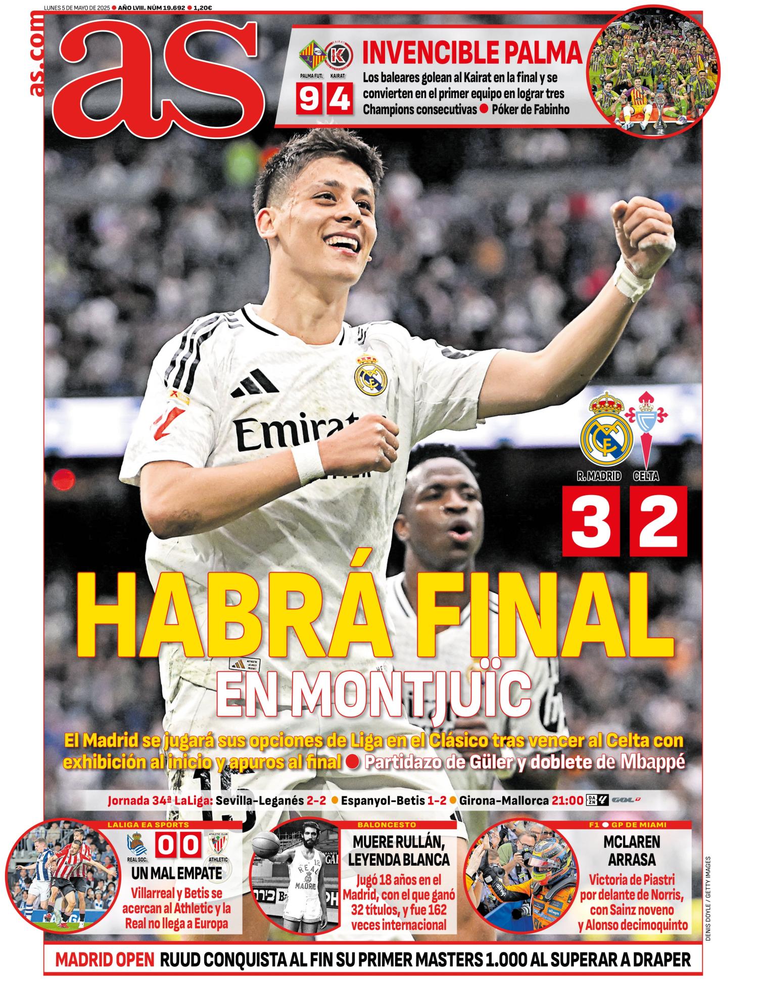 El diario as, en su portada para este lunes 5 de mayo de 2025, destaca la victoria del Real Madrid ante el Celta y señala que "habrá final en Montjuic".