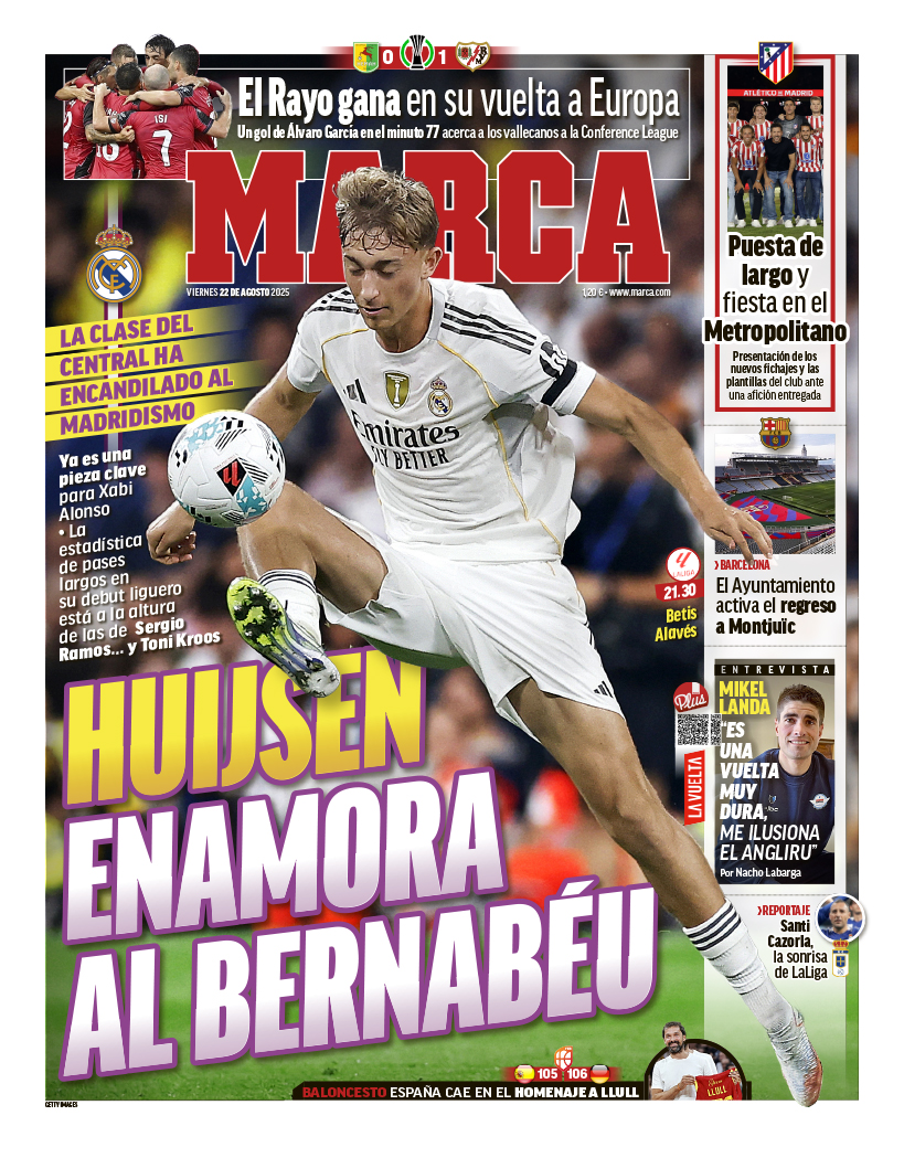 El diario Marca, en su portada para este viernes 22 de agosto de 2025, destaca la pasión que ha desatado Dean Huijsen entre los madridistas.