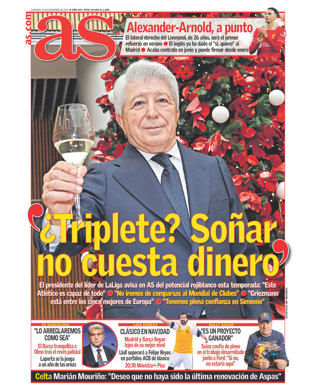 Este domingo 29 de diciembre de 2024, el diario as saca una entrevista con Enrique Cerezo, presidente del Atlético de Madrid, y destaca el 'sí quiero' de Alexander-Arnold al Real Madrid.