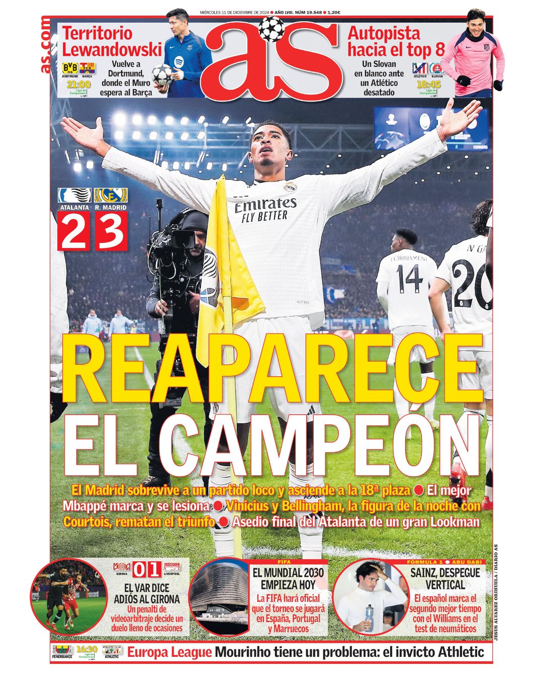 En su portada para este miércoles 11 de diciembre de 2024, el diario as saca en portada a Jude Bellingham, destacando la victoria del Real Madrid frente a la Atalanta. "Reaparece el campeón" titula el periódico.