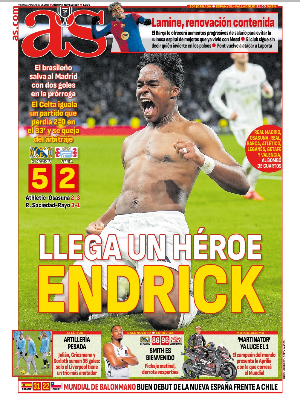 "Llega un héroe Endrick" titula el diario as en su portada para este viernes 17 de enero de 2025, destacando al gran protagonista de la victoria del Real Madrid frente al Celta de Vigo en la Copa del Rey.