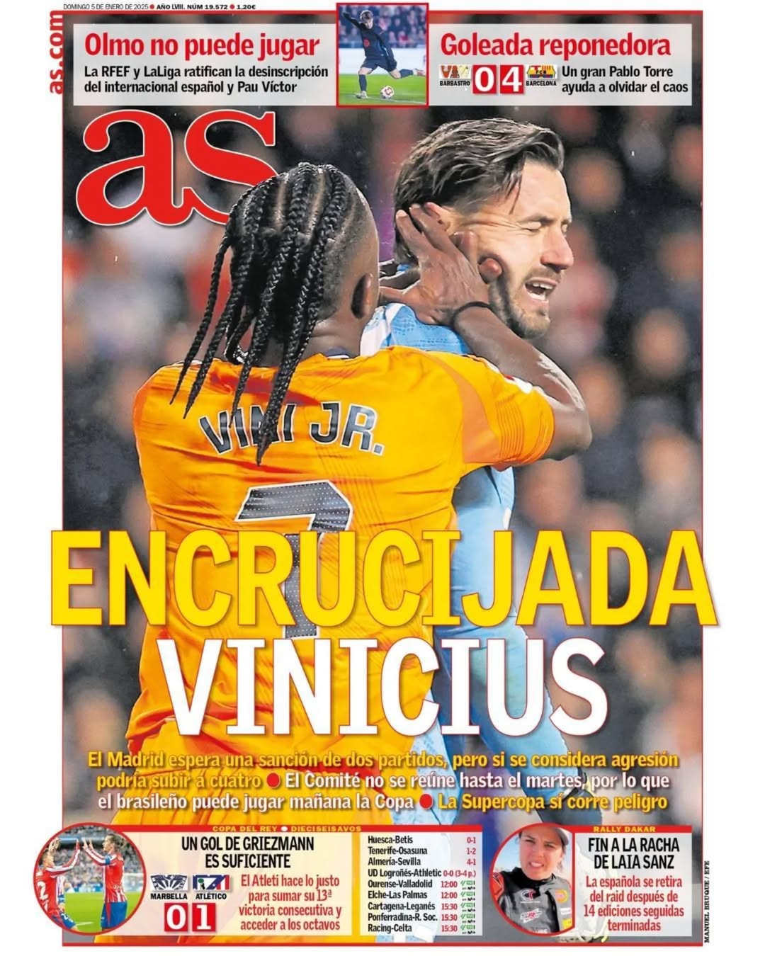 El diario as saca en su portada para este domingo 5 de enero la "encrucijada Vinicius". El Real Madrid espera la sanción del brasileño, que se conocerá el próximo martes.