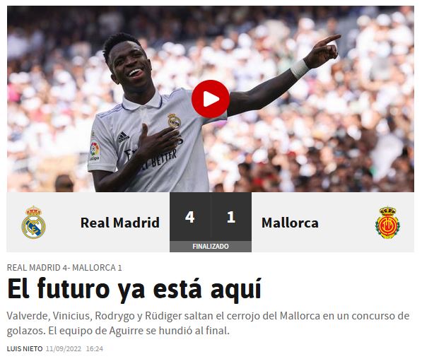 El diario As destaca en la portada de su página web la sensacional actuación de los jóvenes del Real Madrid en el último encuentro disputado ante el Mallorca. Vinícius Junior, Rodrygo Goes, Fede Valverde y Rüdiger se repartieron los goles del partido. “El futuro ya está aquí”, comenta el periódico.