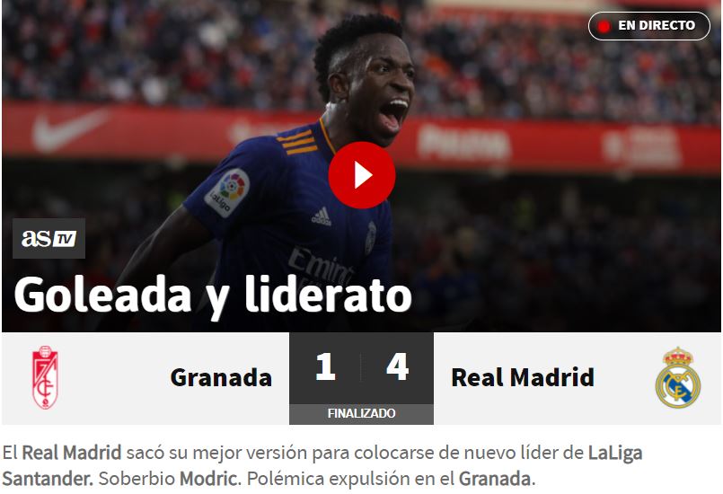 AS también abre con el triunfo del Real Madrid en el Nuevo Los Cármenes. Los de Ancelotti doblegarno al conjunto de Robert Moreno con goles de Asensio, Nacho, Vinicius y Ferland Mendy. Con estos tres puntos se colocan en el liderato.