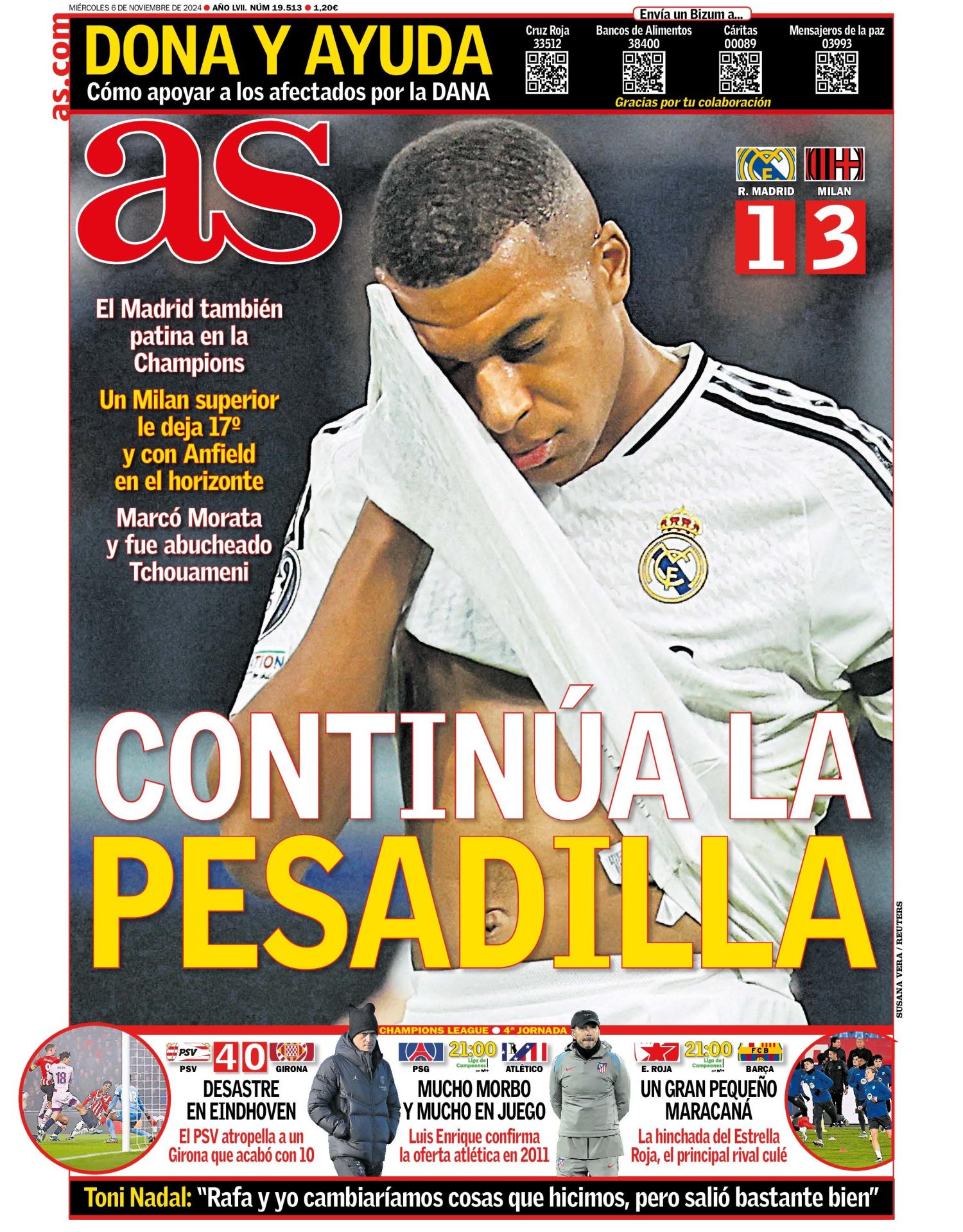 Este miércoles 6 de noviembre de 2024, el diario as destaca en portada la derrota del Real Madrid ante el AC Milan (1-3) y titula: "Continúa la pesadilla". Saca en primera plana a Kylian Mbappé y resalta los detalles de un encuentro que deja al conjunto blanco en la 17ª posición de la Champions League.