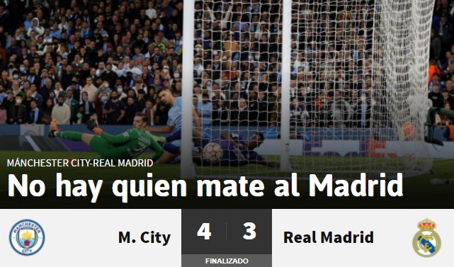 El Manchester City toma ventaja en la ida de semifinales de la Champions tras imponerse 4-3 al Real Madrid. Los de Guardiola fueron superiores e, incluso, tuvieron dos goles de ventaja durante muchos minutos del partido. Sin embargo, el conjunto blanco llega vivo al partido de vuelta en el Bernabéu, algo que ha destacado el diario As, que ha titulado "No hay quien mate al Madrid".