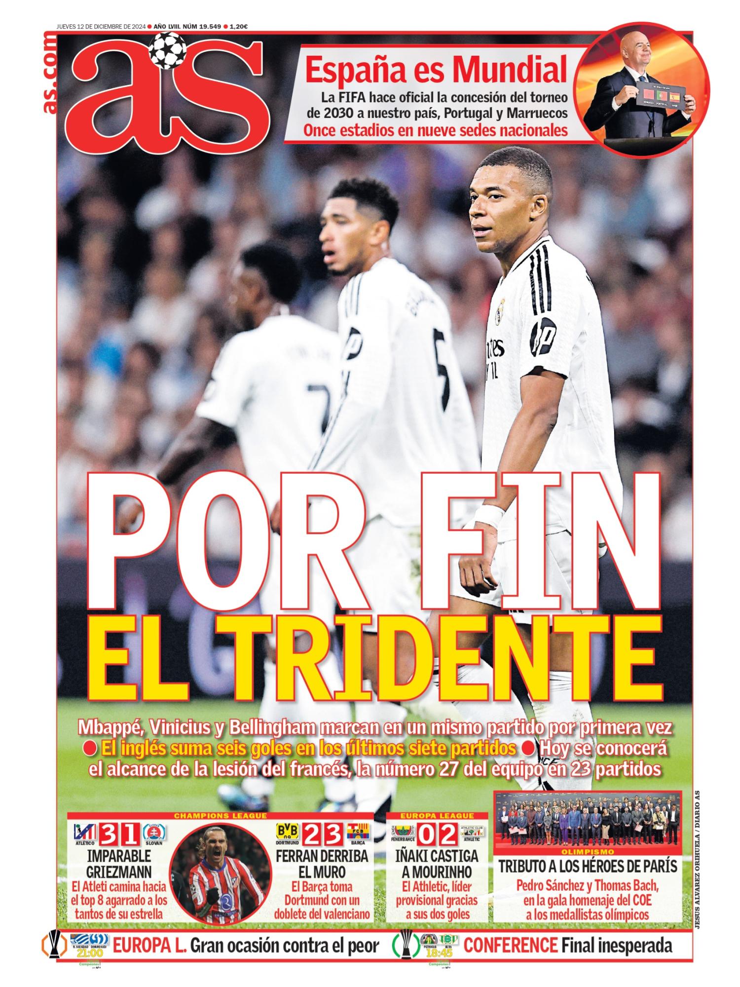 El tridente formado por Bellingham, Mbappé y Vinicius (BMV) acapara la portada del diario as este jueves 12 de diciembre de 2024. El periódico destaca que, por primera vez, frente a la Atalanta, los tres fueron capaces de marcar un gol cada uno en un mismo partido.