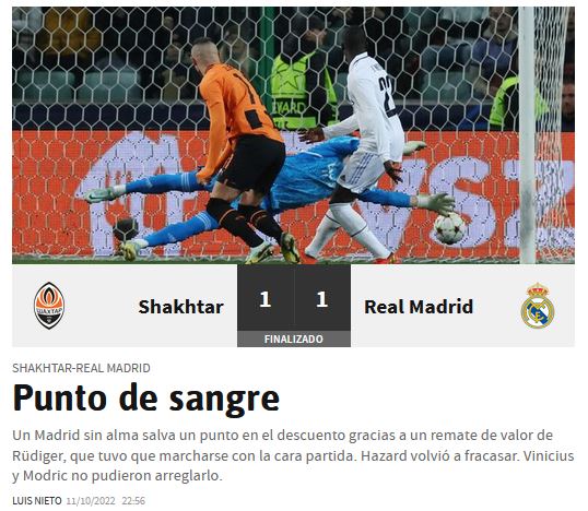 El diario As destaca en la portada de su página web la garra mostrada por Rüdiger ante el Shakhtar. El defensor alemán se dejó el físico al rematar un centro de Toni Kroos ante la salida de Trubin, que terminó en un choque fatal. El central del Real Madrid terminó el encuentro desangrado. "Punto de sangre", comenta el periódico.