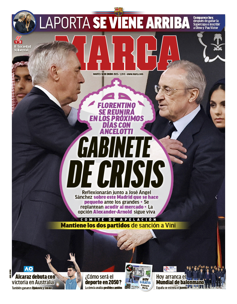 El diario Marca abre con la reunión inminente que habrá entre Ancelotti y Florentino para afrontar la crisis del Real Madrid.