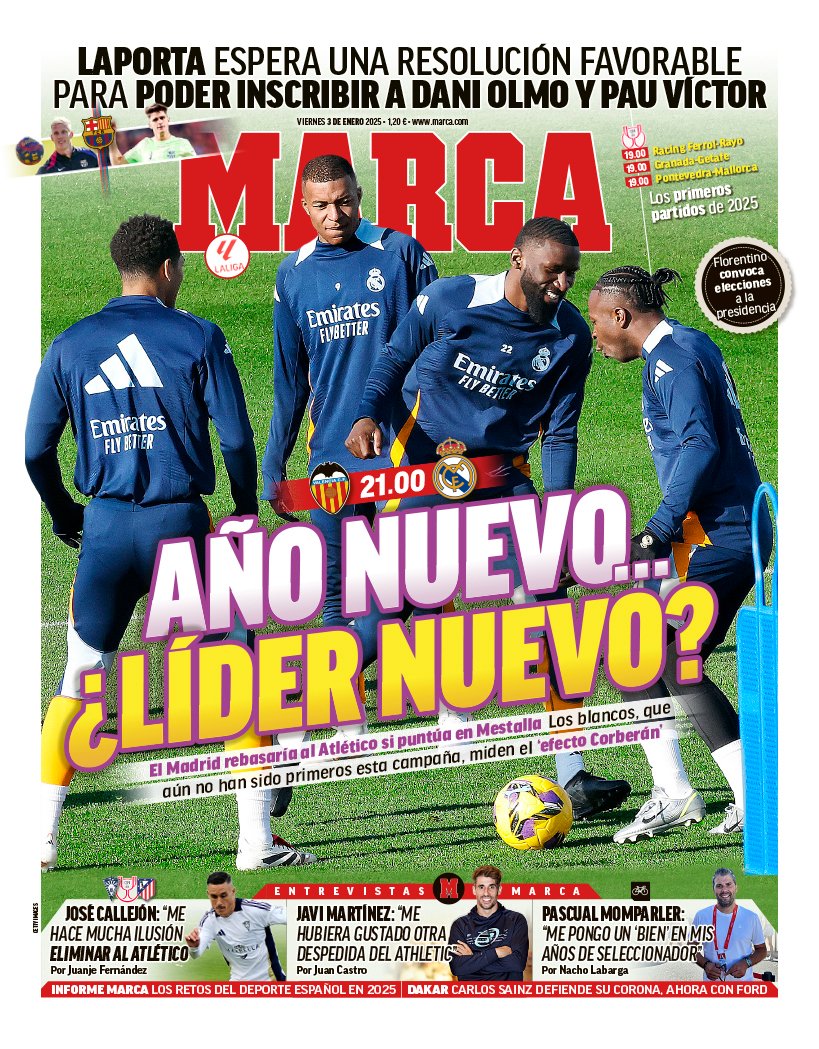 En su portada de este viernes, el diario Marca destaca la previa del Valencia - Real Madrid que se disputará esta noche en Mestalla correspondiente a la jornada 12 de LaLiga.