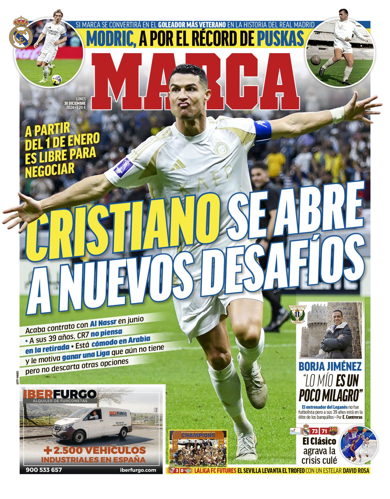 Este lunes 30 de diciembre de 2024, el diario Marca saca en portada a un Cristiano Ronaldo que a partir del próximo miércoles podrá negociar con cualquier equipo y que está abierto a nuevos desafíos. A sus 39 años, el luso no piensa en la retirada y no descarta un cambio de aires. Asimismo, el periódico destaca el récord que podría conseguir Luka Modric en los próximos partidos: convertirse en el jugador más veterano en marcar un gol con la camiseta del Real Madrid; un hito en poder de Puskas.