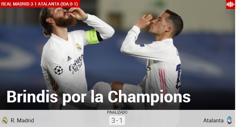 Marca celebra el pase a los cuartos de final del Real Madrid ante el Atalanta. Los blancos fueron superiores en todo momento y consiguieron doblegar por 3-1 al conjunto italiano para acceder a la próxima ronda.