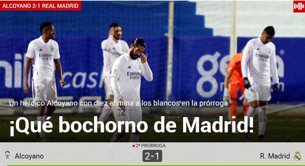 El diario Marca abre su portada esta noche con el encuentro de Copa del Rey entre Alcoyano y Real Madrid. Pésimo partido de los de Zidane que quedan apeados del torneo nacional tras perder en la pequeña localidad alicantina por 2-1. "¡Qué bochorno del Madrid!", exclama el periódico.
