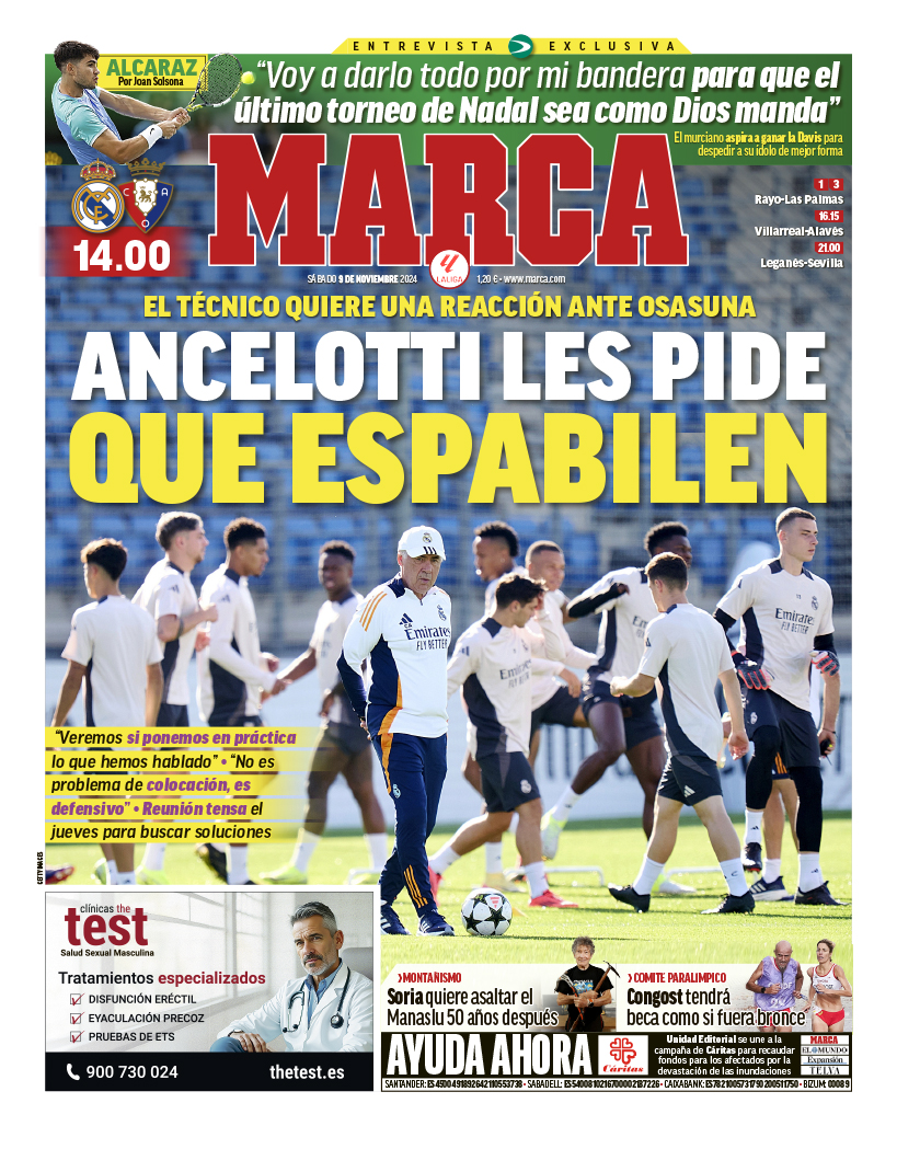 El diario Marca destaca en su portada de este sábado 9 de noviembre el mensaje que circula en el vestuario del Real Madrid para intentar reaccionar ante la crisis de malos resultados. "Ancelotti les pide que espabilen" es el titular, y es que el técnico italiano ha tenido una reunión tensa con los jugadores para tratar de buscar una soluciones que cada vez se antojan más complicadas de encontrar.