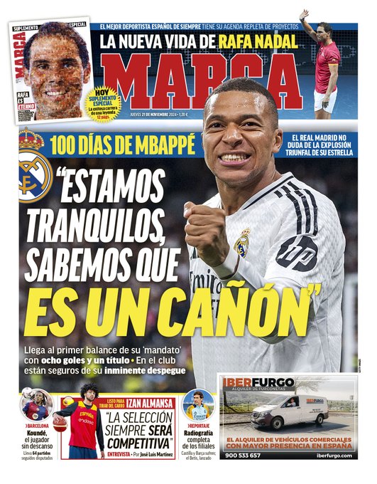 La portada de este jueves del diario Marca viene protagonizada por Kylian Mbappé y el mensaje que lanzan en el Real Madrid sobre él: "Estamos tranquilos, sabemos que es un cañón".