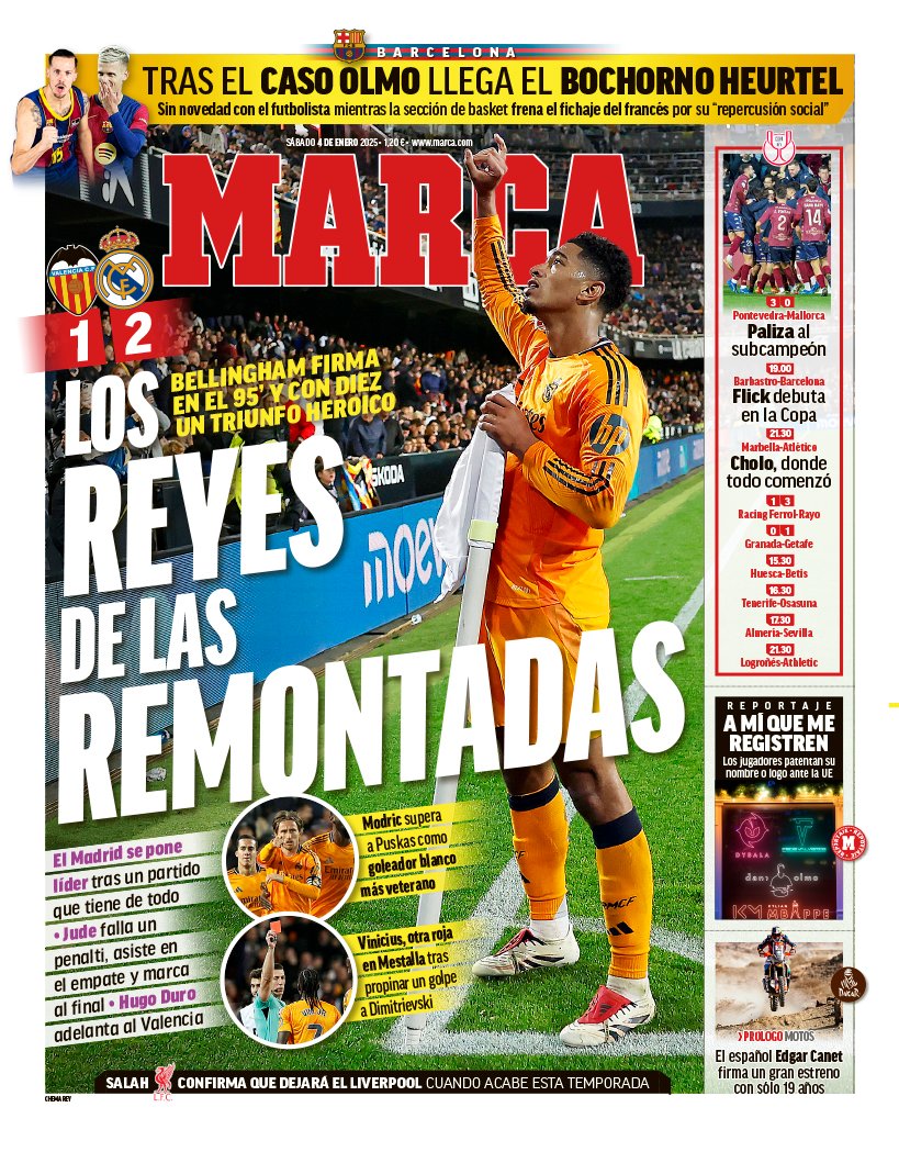 En su portada del sábado 4 de enero el diario Marca destaca la épica remontada del Real Madrid en Valencia gracias a los goles de Luka Modric, que se convierte en el goleador más veterano del club, y de Jude Bellingham, que vuelve a aparecer en un partido importante.