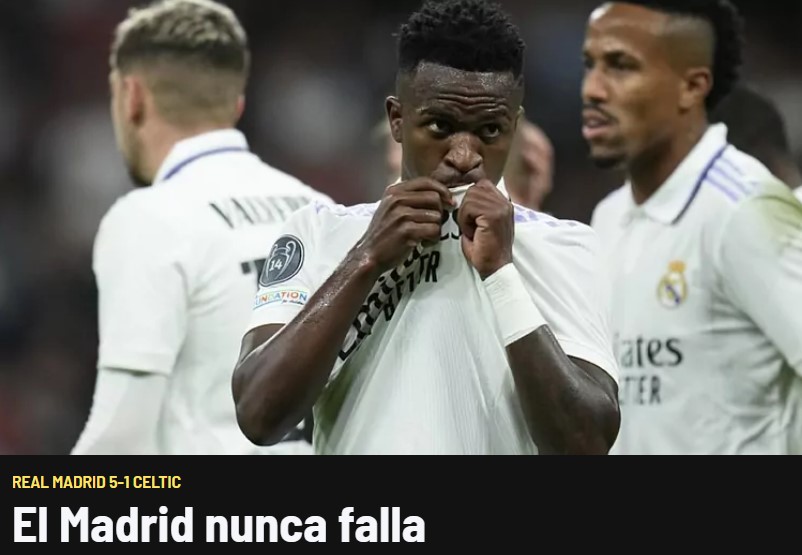Marca destaca en la portada de su página web la contundente victoria del Real Madrid sobre el Celtic de Glasgow. Los blancos han ganado por 5 a 1, por lo que Marca menciona que el conjunto local no "falla". De nuevo, a pesar del nivel inferior del rival, los blancos cumplen en un partido importante como lo era hoy, donde el Real Madrid se jugaba la primera posición del grupo., y es que cuando hablamos de citas importantes, como bien dice Marca, "el Madrid nunca falla".