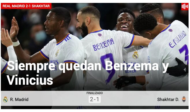 La victoria del Real Madrid ante el Shakhtar Donetsk en Champions ha vuelto a poner de manifiesto la importancia de Vinicius Jr. y de Karim Benzema. El diario Marca apunta la labor de ambos en su titular tras el encuentro de la cuarta jornada de la fase de grupos, la cual se ha saldado con los tres puntos favorables a los blancos.