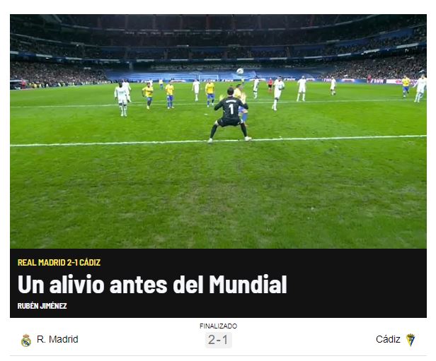 El diario Marca destaca en la portada de su página web la victoria del Real Madrid ante el Cádiz con un Toni Kroos que fue elegido mejor jugador del partido tras repartir una asistencia a Militao y marcar gol. Vinícius fue perseguido durante todo el encuentro en un duelo donde Courtois volvió a encajar gol. “Un alivio antes del mundial”, comenta el periódico
