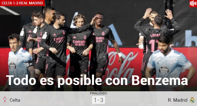 Marca destaca el doblete de Karim Benzema ante el Celta de Vigo. El Real Madrid fue muy superior en la primera media, en la que lograron distanciarse en el marcador por medio del francés. A partir de ahí, los vigueses adelantaron sus líneas y complicaron la vida a los de Zinedine Zidane, que a punto estuvieron de pagar muy caro el esfuerzo ante el Atalanta. Asensio sentenció en la última jugada del encuentro.