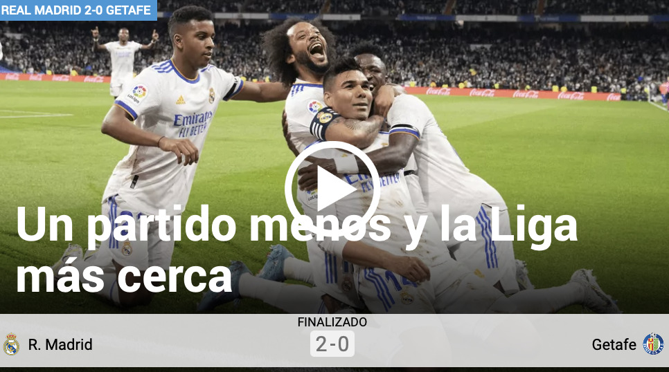 El diario MARCA títula en su página web "un partido menos y la Liga más cerca" el sobresaliente triunfo del Real Madrid contra el Getafe. Un partido trampa, pero que los de Ancelotti consiguieron solventar con creces y ahora están un paso más cerca del título.