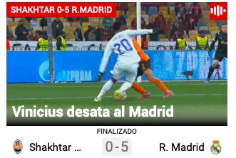 El diario Marca describe la victoria del Real Madrid ante el Shakhtar Donetsk en base al rendimiento de Vinicius Jr. El brasileño ha sido protagonista en la goleada por cero a cinco, donde ha anotado un doblete para volver a sumar de a tres después de tres encuentros sin conocer la victoria.