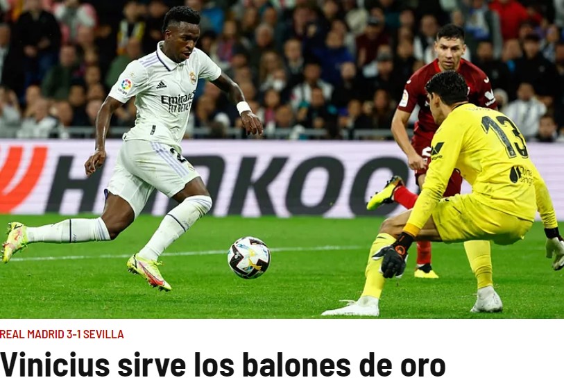 El periódico deportivo español, MARCA, realza en la portada de su página web las asistencias que ha dado Vinicius Junior para que el Real Madrid sumará de tres hoy. En total han sido dos, la primera a Modric en el minuto 5 de encuentro, y la segunda a Lucas Vázquez en el 78. El periódico hace una metáfora con el Balón de Oro levantado recientemente por Benzema, y la calidad de asistencias del brasileño, dejando el balón a sus compañeros en boca de gol.