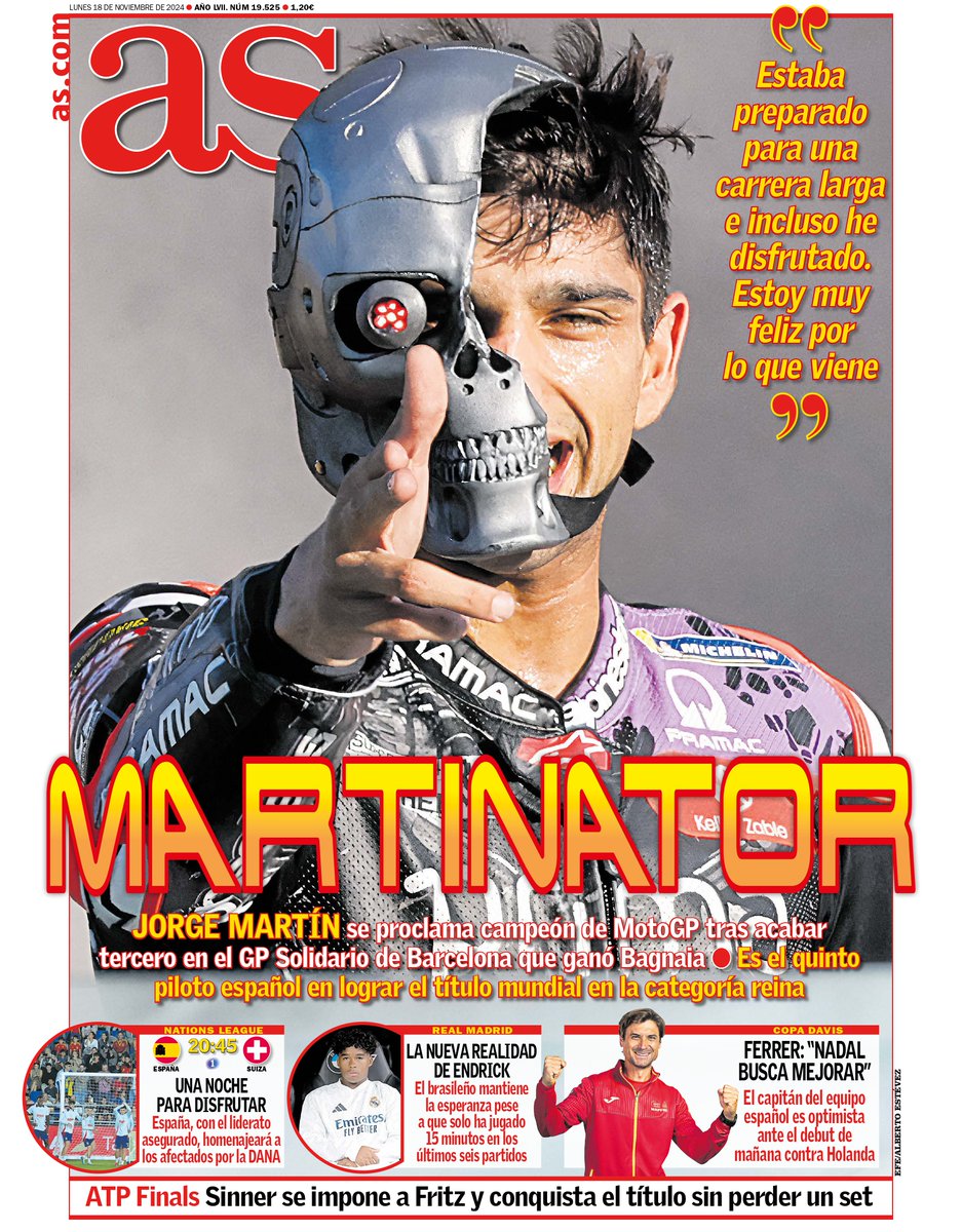 Este lunes 18 de noviembre de 2024, las portadas deportivas se centran en Jorge Martín, reciente campeón de MotoGP. Además, destacan el España-Suiza (20:45 horas, La1) y "la nueva realidad de Endrick", quien mantiene la esperanza de jugar y ser importante en el Real Madrid, pese a haber disputado solo 15 minutos en los últimos 6 partidos. Por último, cabe señalar que en Bernabéu Digital llevamos nuestra última entrevista a Tobias Altschäffl, periodista del diario Bild, que analiza el culebrón Davies, así como otros rumores vinculados con el Madrid y el Bayern.