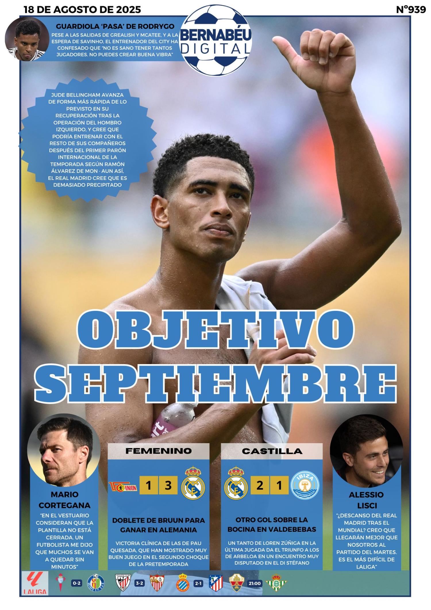 Para este lunes 18 de agosto, Bernabéu Digital destaca en su portada la recuperación de Jude Bellingham. En el mejor de los casos, podría regresar tras el primer parón de selecciones en septiembre.