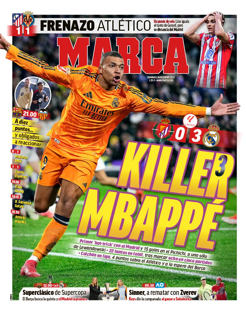 Este domingo 26 de enero de 2025, las portadas deportivas se centran en Kylian Mbappé, el gran protagonista de la última victoria del Real Madrid ante el Valladolid.