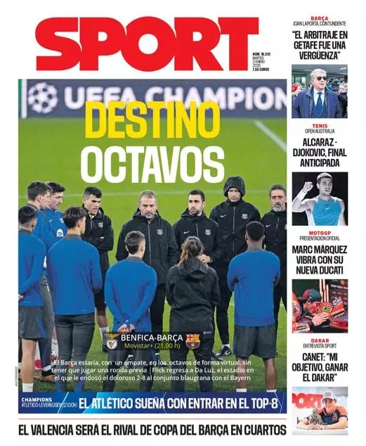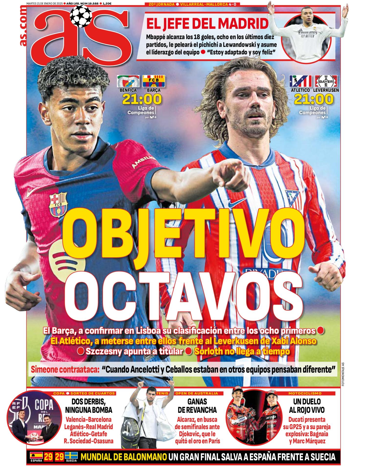 Este martes 21 de enero de 2025, las portadas deportivas se centran en el objetivo Champions de Barça y Atlético. Los culés buscan certificar su pase directo a octavos, mientras que los rojiblancos tratarán de meterse en el top-8 antes de la última jornada de Liga de Campeones.