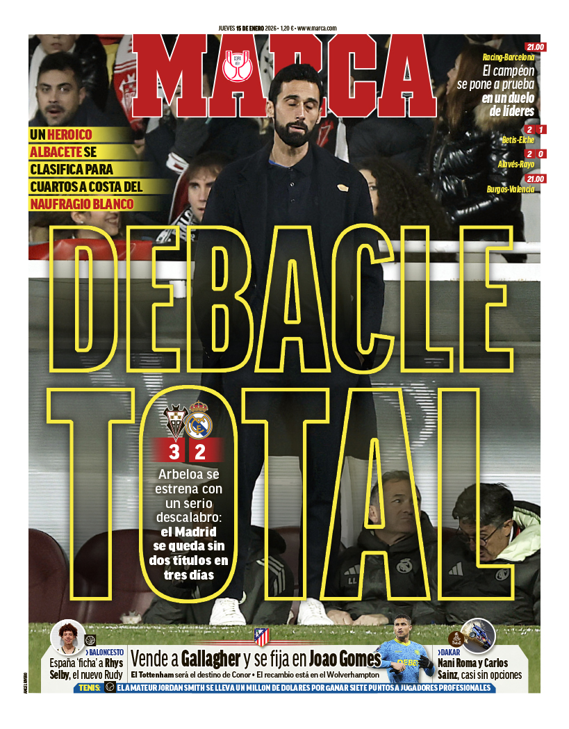 Marca abre su portada con la foto de Arbeloa lamentandose después de revibir uno de los tres goles que ayer le endosó el Albacete al Real Madrid. El conjunto blanco volvió a mostrar una imagen paupérrima y el periódico se centra en la pérdida de dos títulos en tres días.