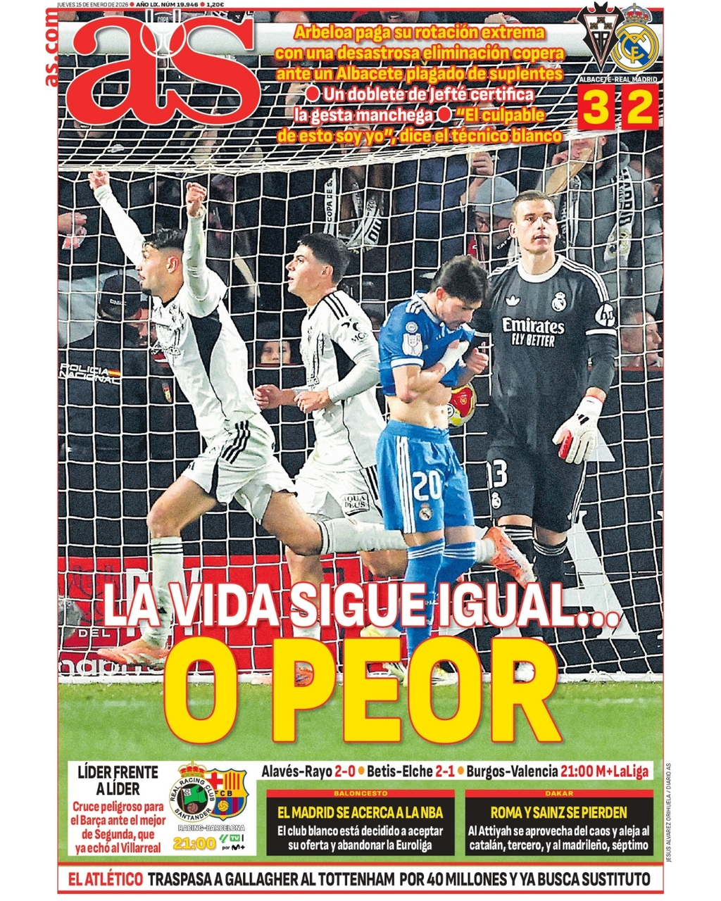 As, por su parte, sigue la misma línea. "La vida sigue igual o peor" es el titular que ha elegido el diario tras la derrota del conjunto blanco en el Carlos Belmonte y echa en cara a Arbeloa su rotación extrema ante un Albacete que está a un punto de los puestos de descenso a Primera RFEF.