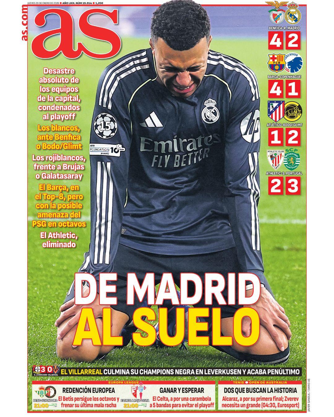 El Diario As titula ´De Madrid al suelo´ haciendo referencia al pinchazo de los blancos en Lisboa y al bajón anímico que ha supuesto perder un partido importante después del buen momento que atravesaba el equipo.