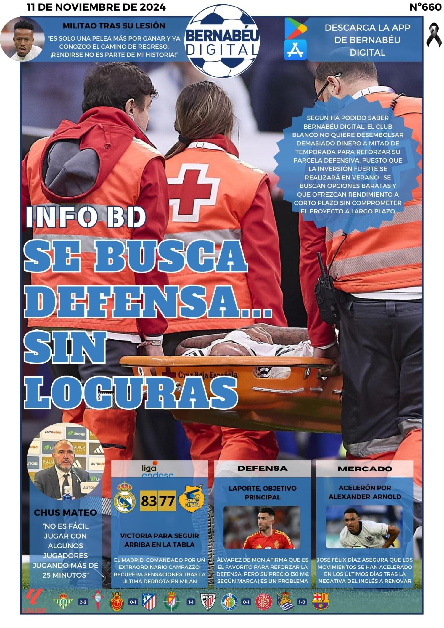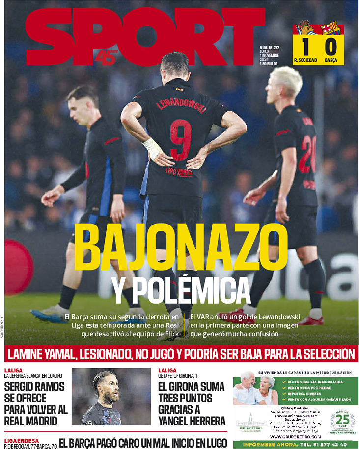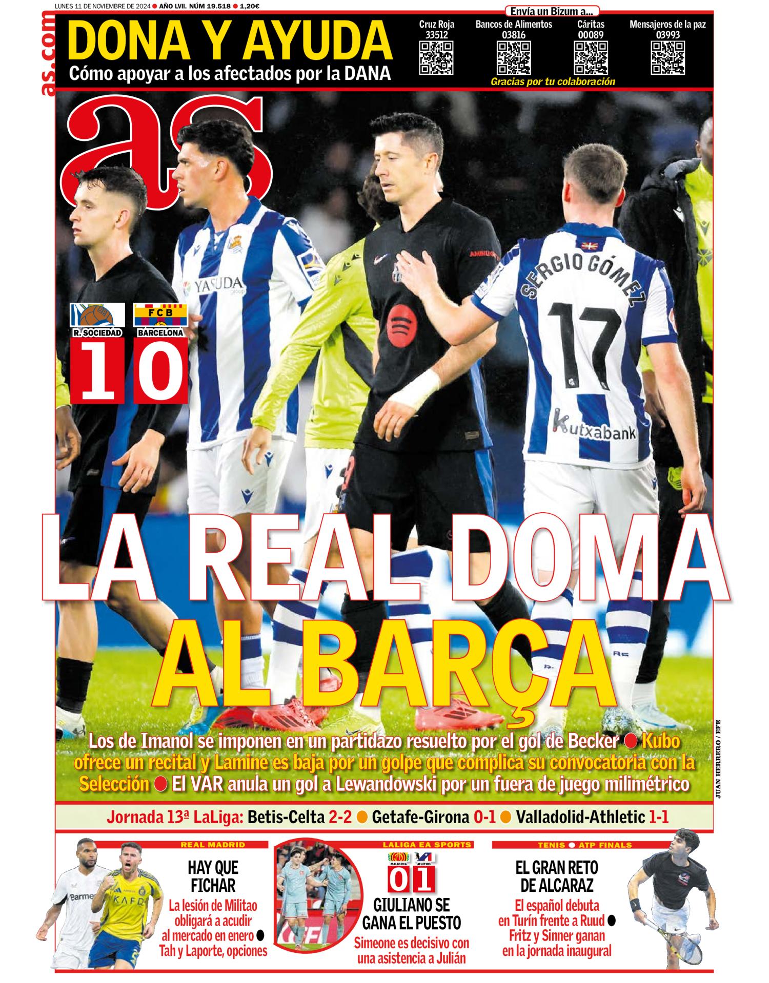 Las portadas deportivas de este lunes 11 de noviembre de 2024 se centran en la derrota del FC Barcelona ante la Real Sociedad. "Traspié del Barça" titula Marca, "La Real doma al Barça" destaca el diario as y "Bajonazo y polémica" remarca Sport. Por nuestra parte, en Bernabéu Digital explicamos en nuestra primera plana los detalles de la búsqueda de un nuevo central por parte del Real Madrid tras la lesión de Militao. Una búsqueda de la que también se hacen eco tanto as como Marca.