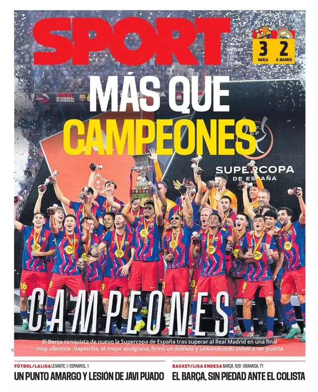 Por parte del Sport, en Cataluña tiran de eslogan culé, para hablar de "Más que campeones" haciendo referencia al conocido "más que un club". Destaca, como el resto de medios, a Raphinha y la emoción vivida en el Alinma Stadium donde el Barcelona levantó una nueva Supercopa de España, poniendo tres de ventaja con el Real Madrid en este momento de la historia.