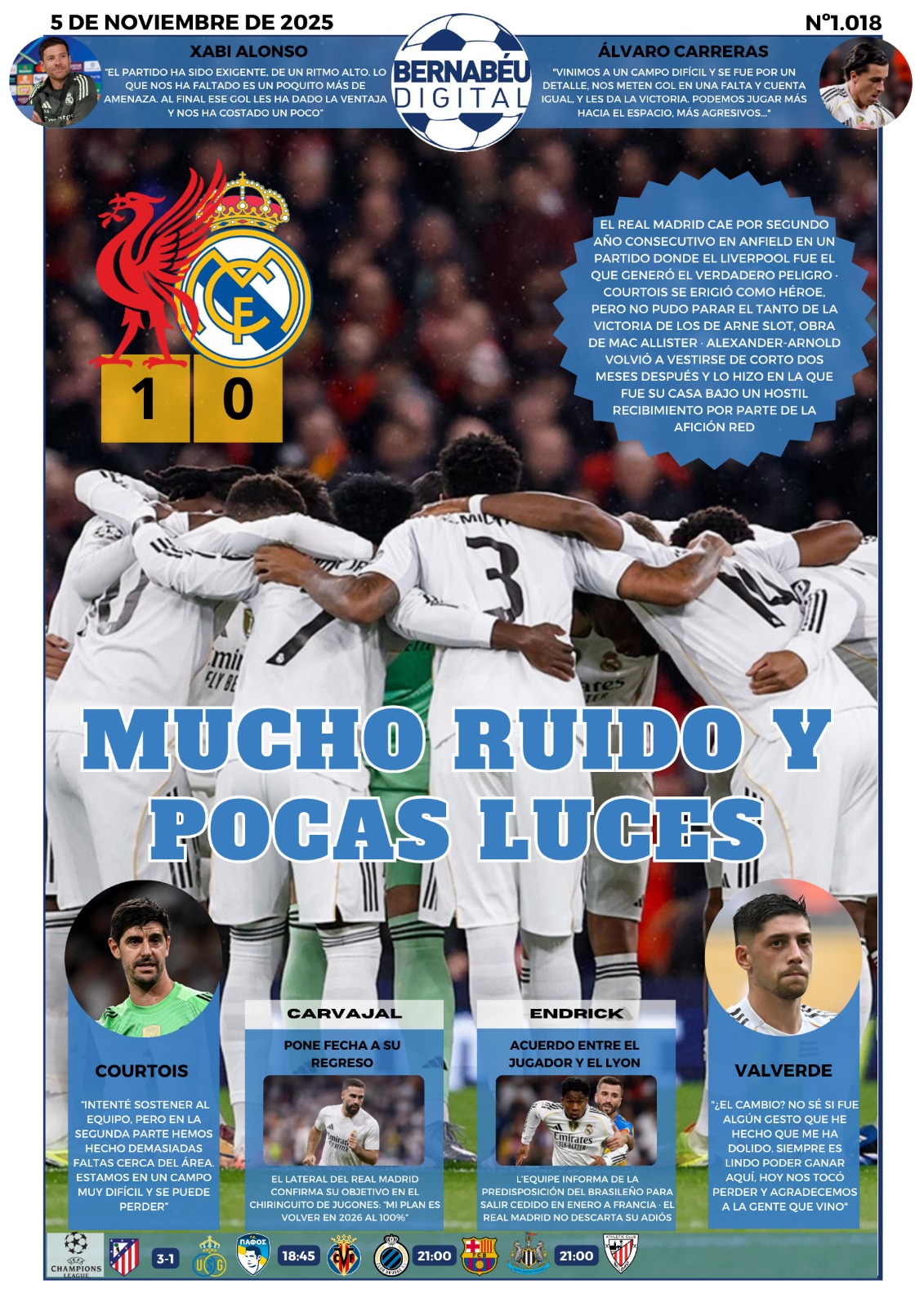 En Bernabéu Digital, hemos decidido abrir portada este miércoles 5 de noviembre de 2025 con el Liverpool 1-0 Real Madrid.