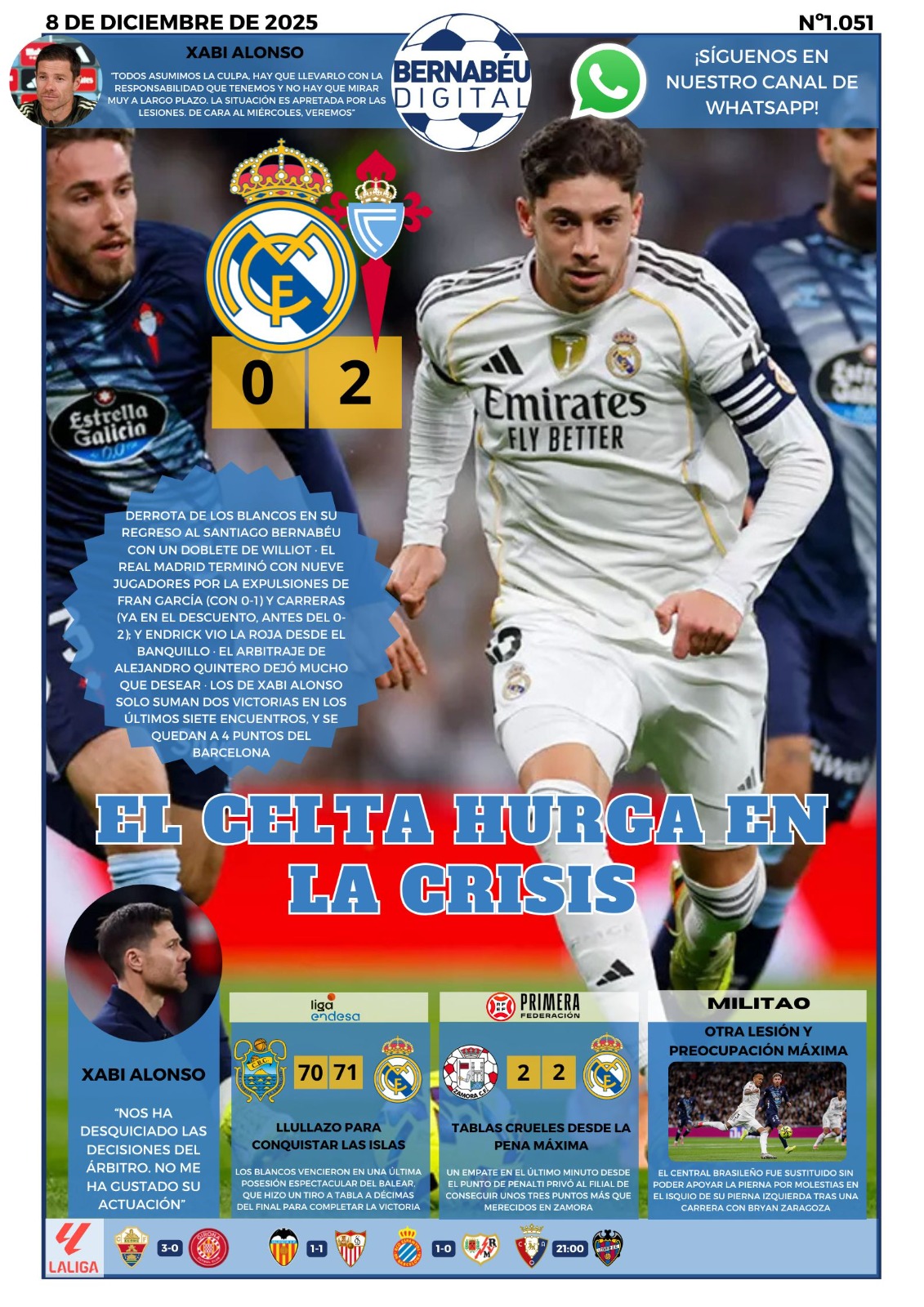 En la portada BD de este lunes destacamos la derrota del Real Madrid en su regreso al Santiago Bernabéu. El conjunto blanco ha caído por 0-2 ante el Celta de Vigo gracias al doblete de Williot y una polémica actuación arbitral.